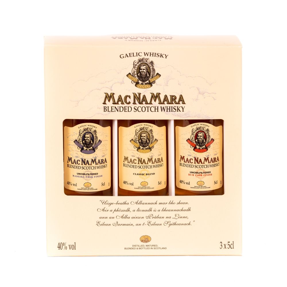 The MacNaMara Gift Box is the ideal introduction to this distinctive Gaelic whisky range, containing 3 x 5cl bottles. It includes the lighter, gently peated MacNaMara Classic, the smooth and subtly sweet Rum Finish matured in Guyanan rum casks, and the soft, complex Madeira Finish enriched by double maturation in Madeira casks.