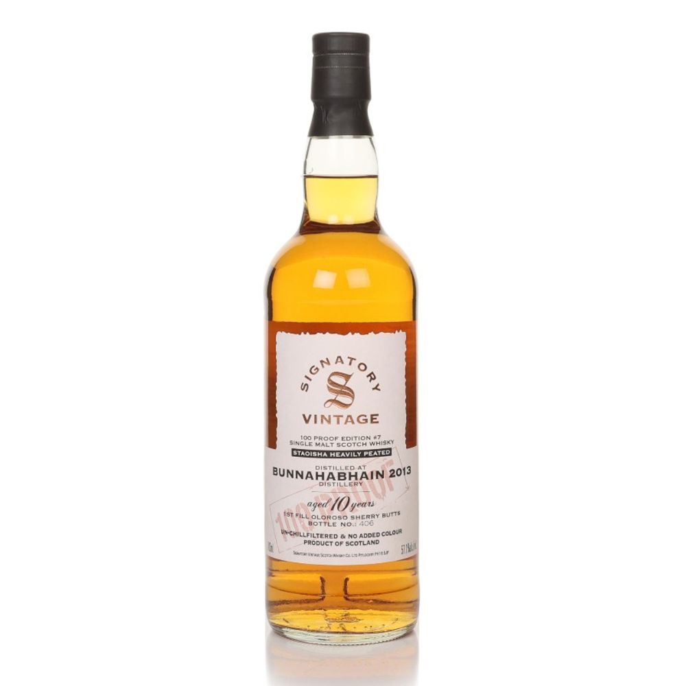 Bunnahabhain Staoisha 10 Year Old 2013 – 100 Proof Edition #7 (Signatory) (70cl, 57.1% ABV) is a rare peated expression from the Islay distillery, matured for a decade in first-fill oloroso sherry butts. Bottled at traditional 100 proof by Signatory, this whisky delivers an intense balance of peat smoke and sherry richness. Expect aromas of iodine, earthy smoke, and meaty malt, leading to bold notes of charcoal, cocoa, and anise on the palate, before finishing with lingering hints of smoked bacon, nuts, and clove. A powerful, full-bodied Islay dram with depth and character.